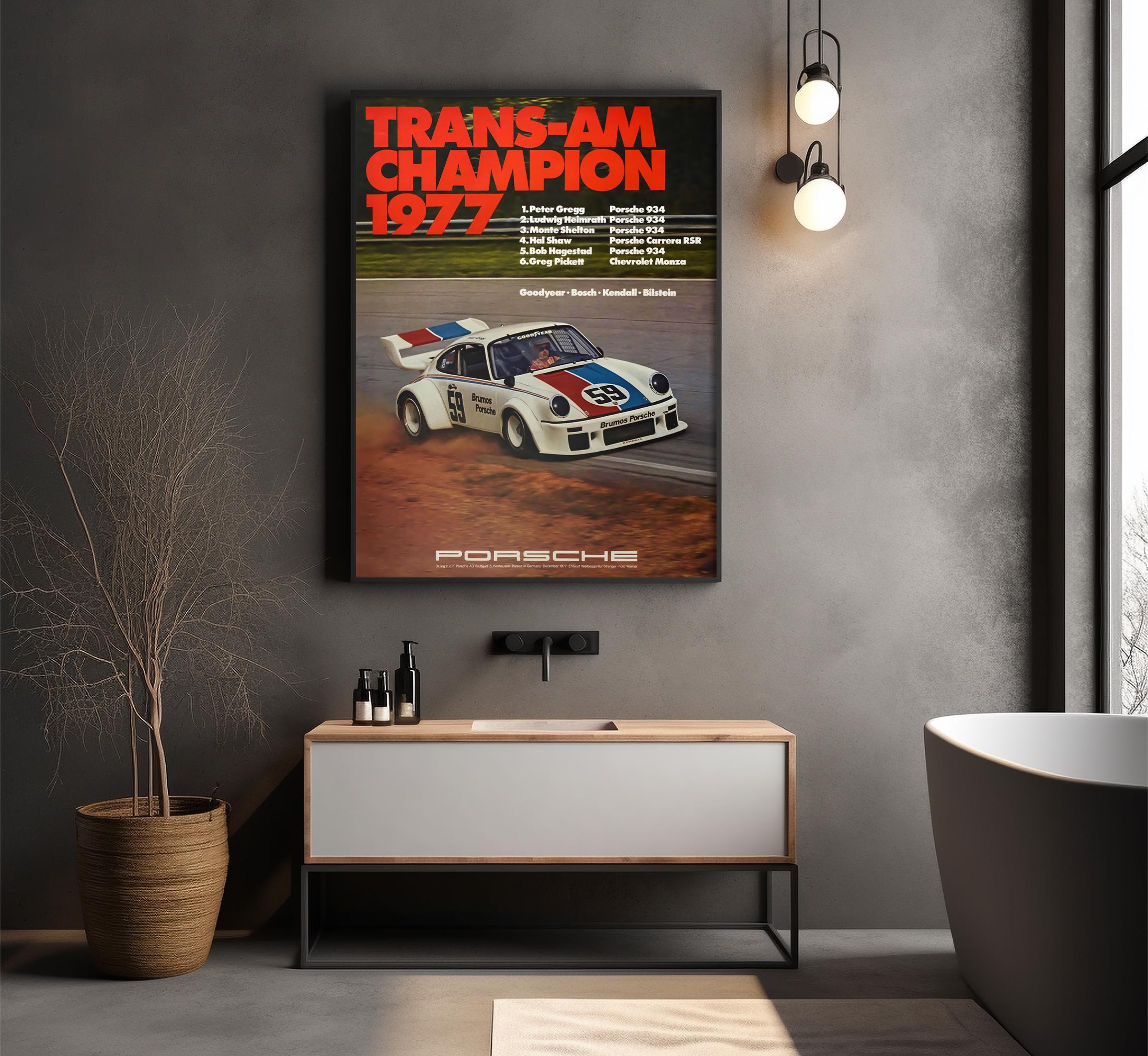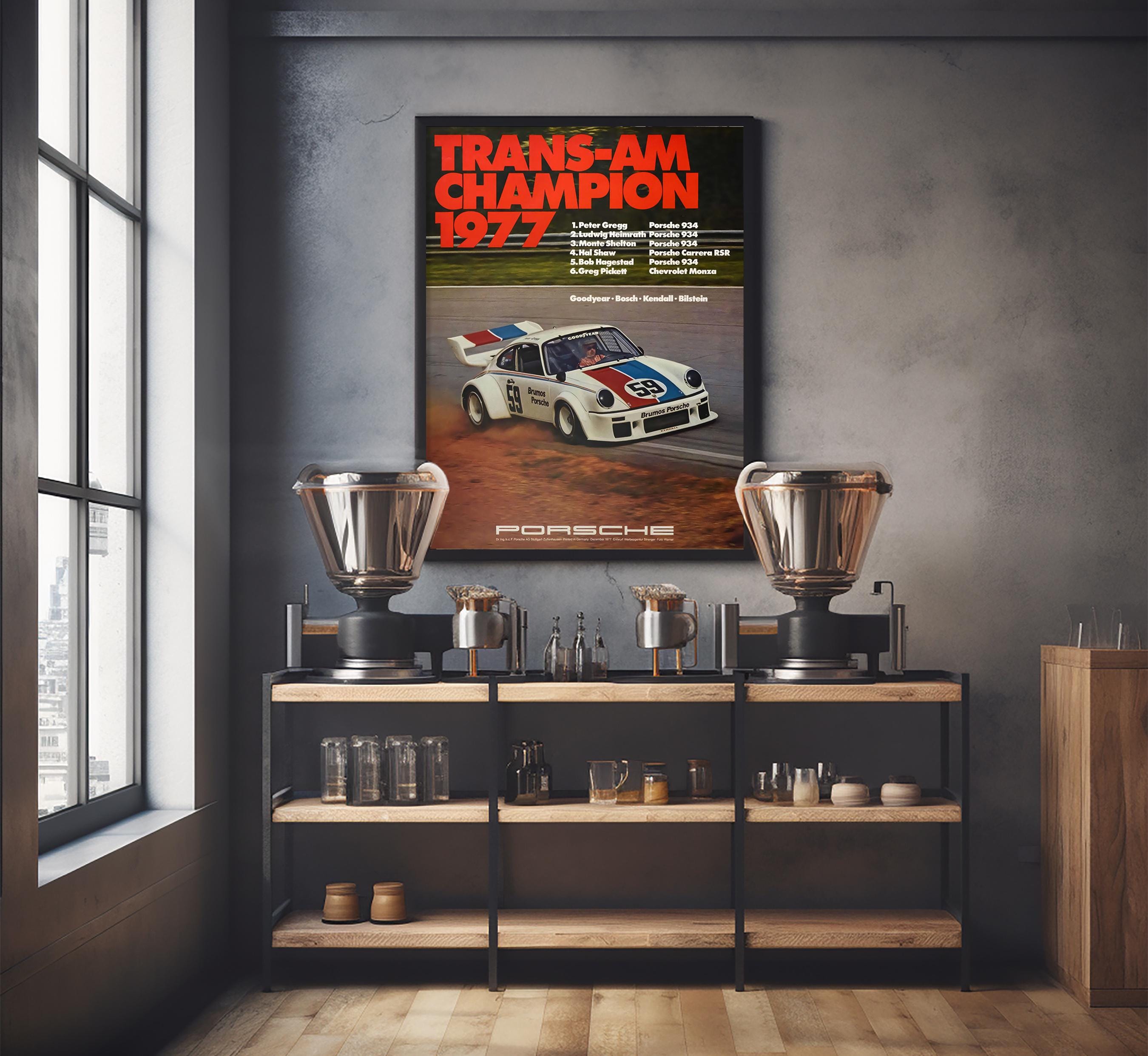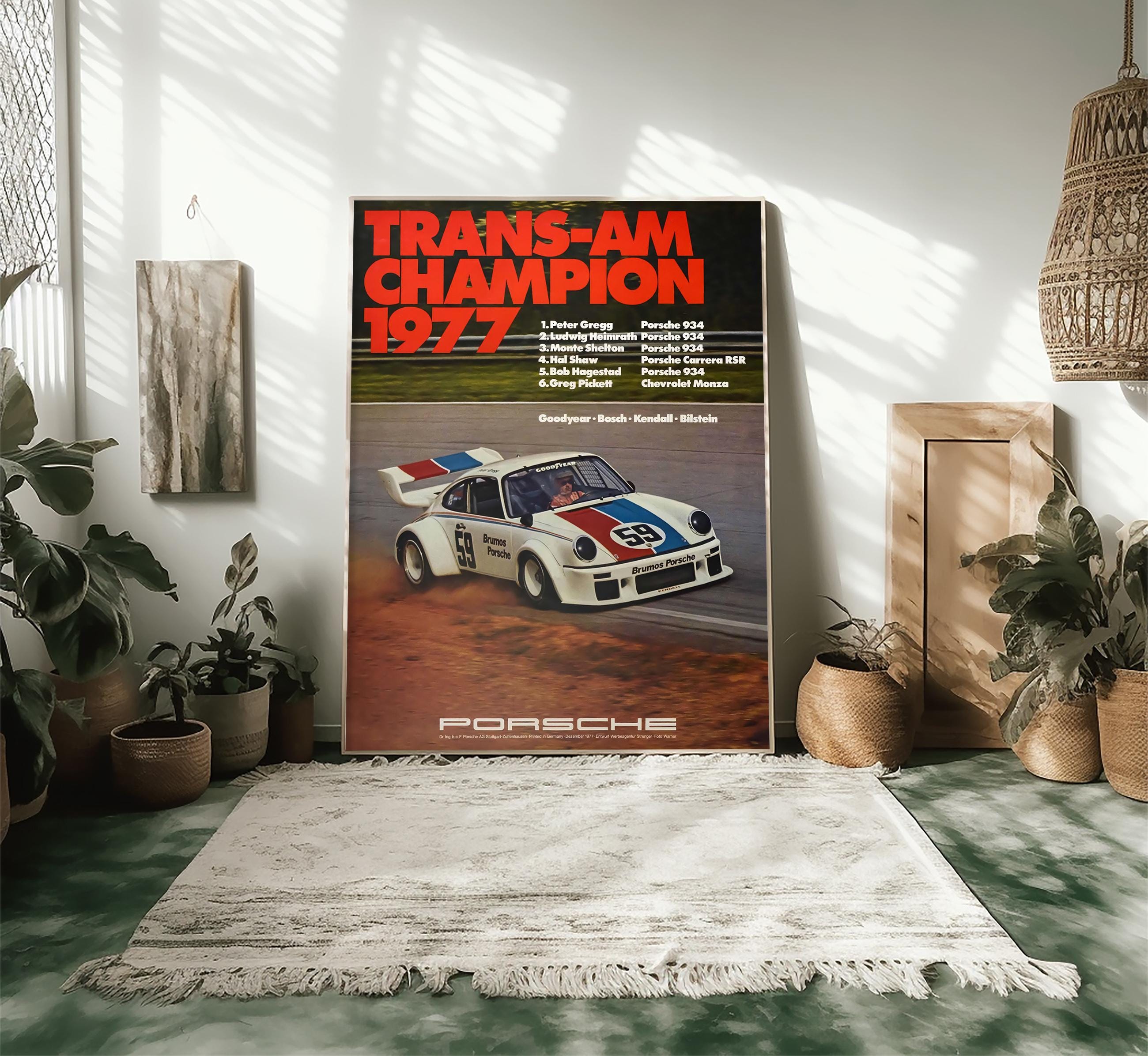 Vintage Porsche 934 Trans-Am Champion 1977 motorsport poster reproduction captures an iconic moment in Brumos Porsche American sports car racing history originating from the late 1970s.