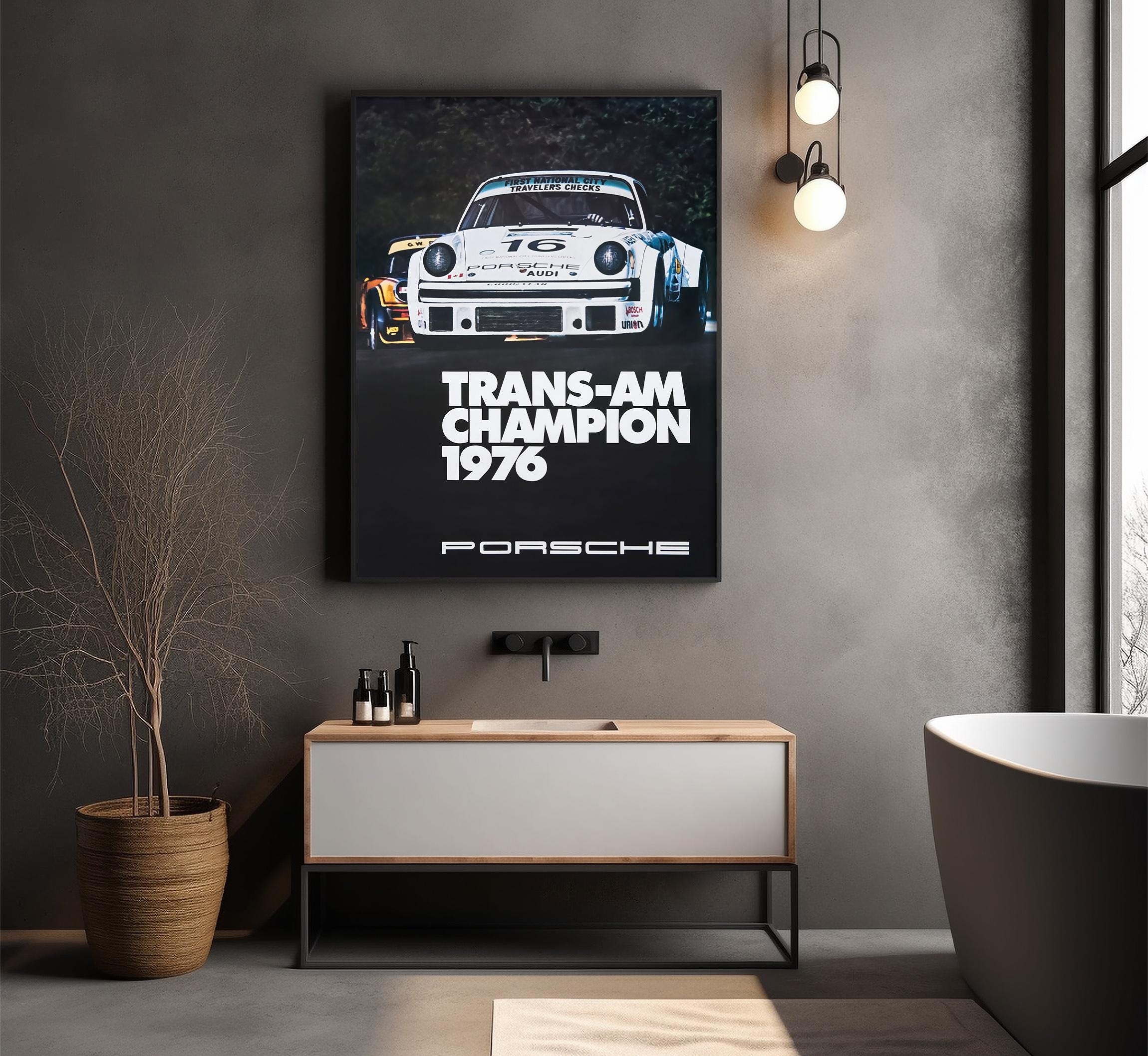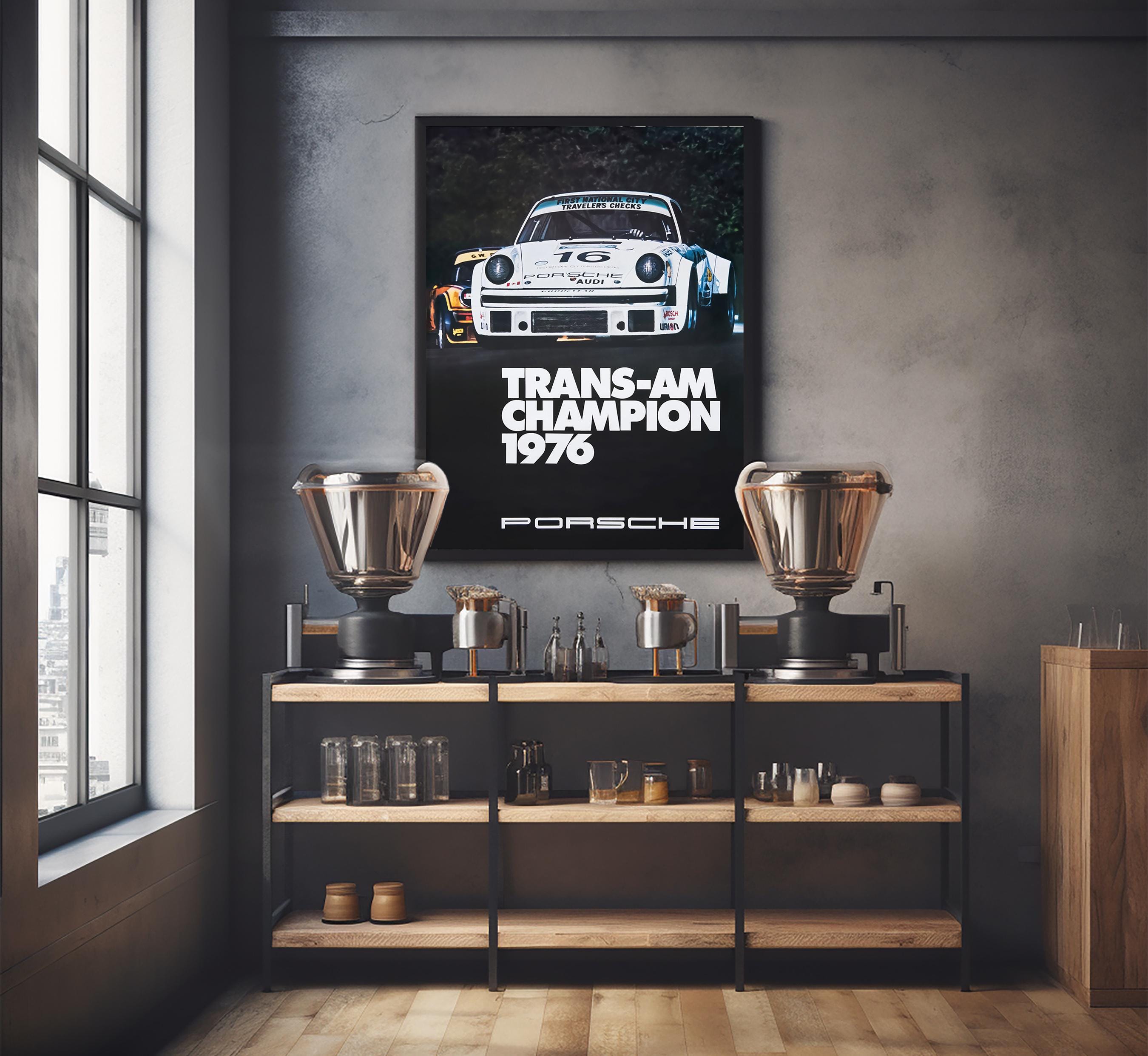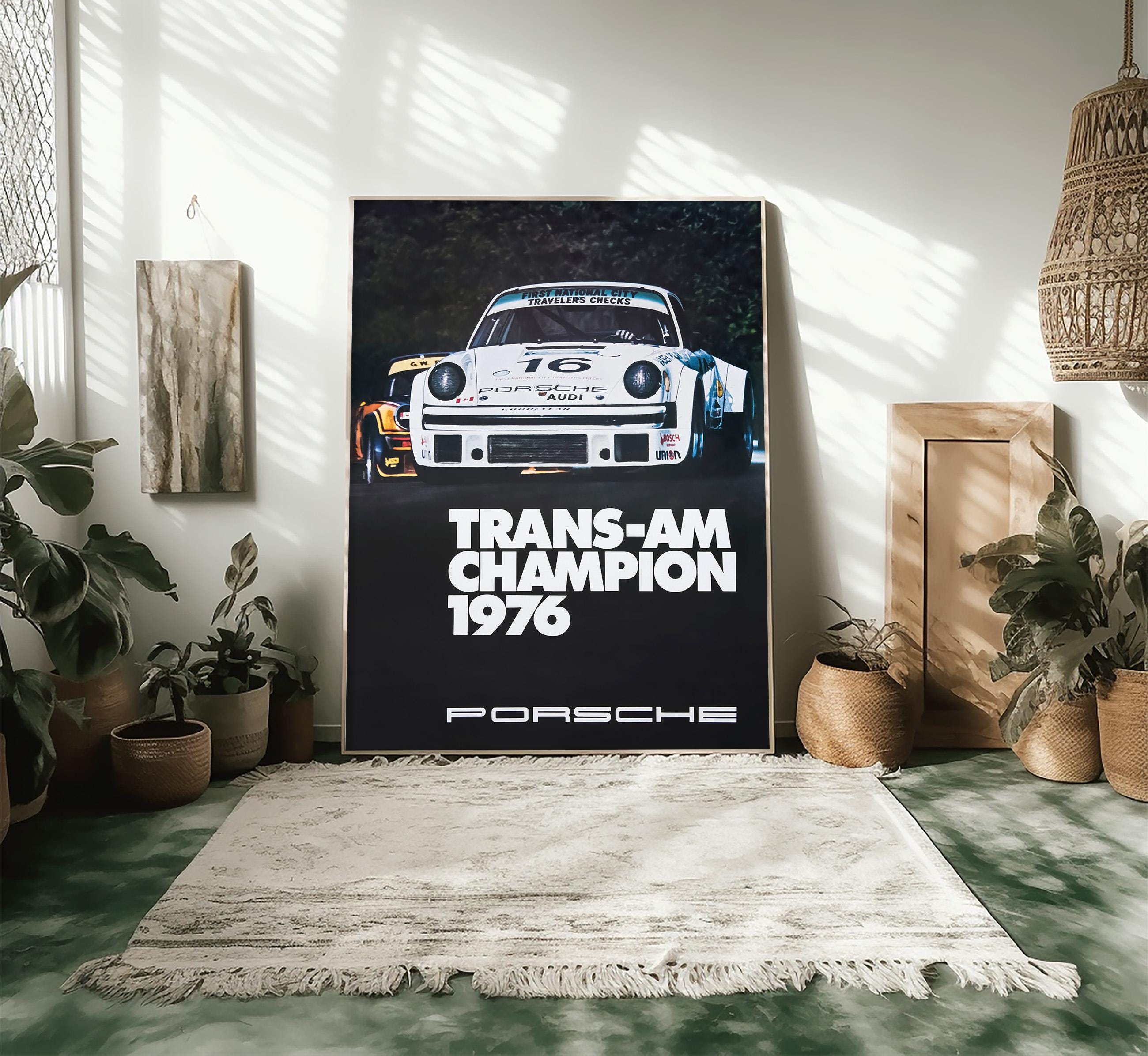 Vintage Porsche Trans-Am Champion 1976 motorsport poster reproduction.