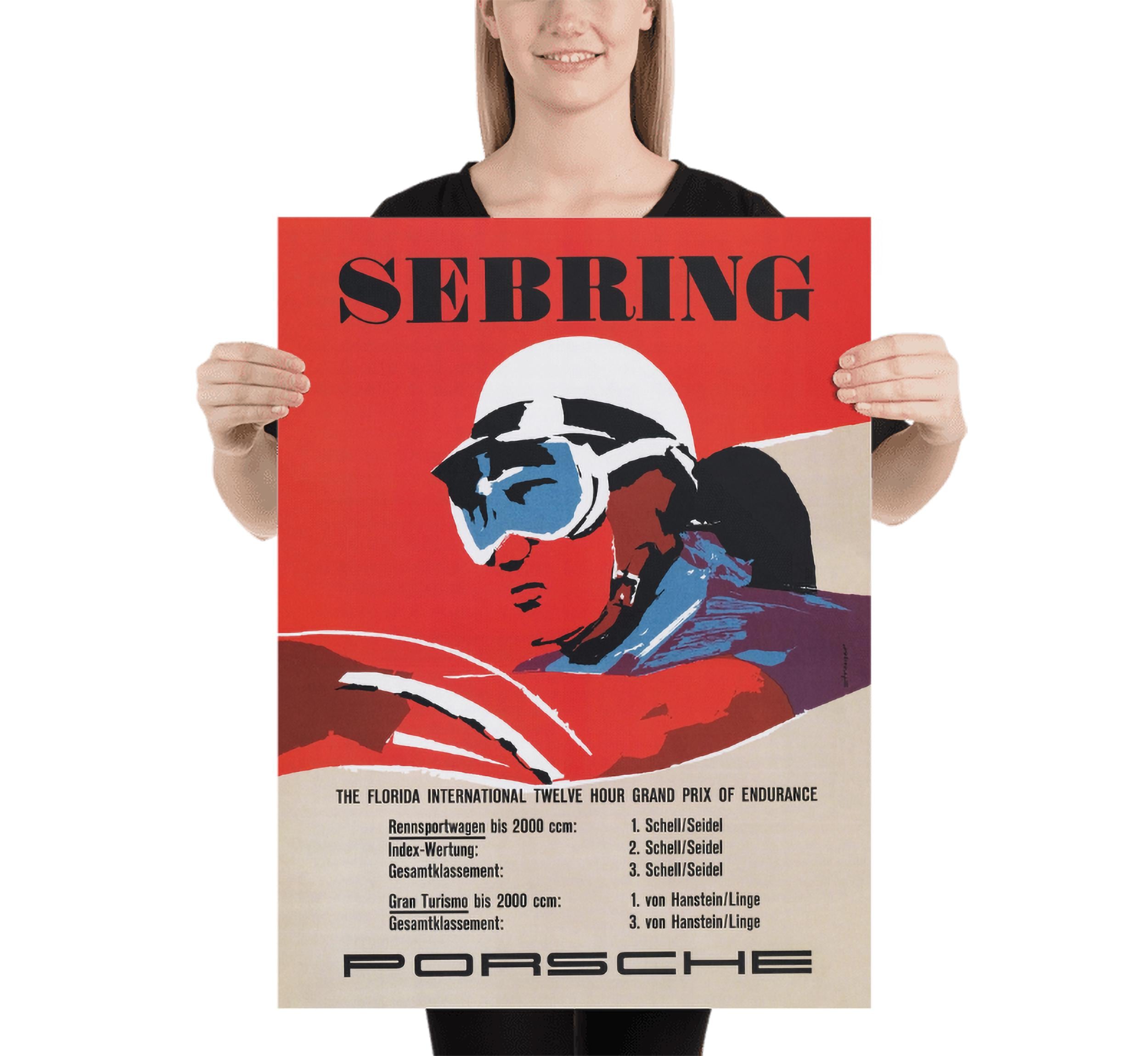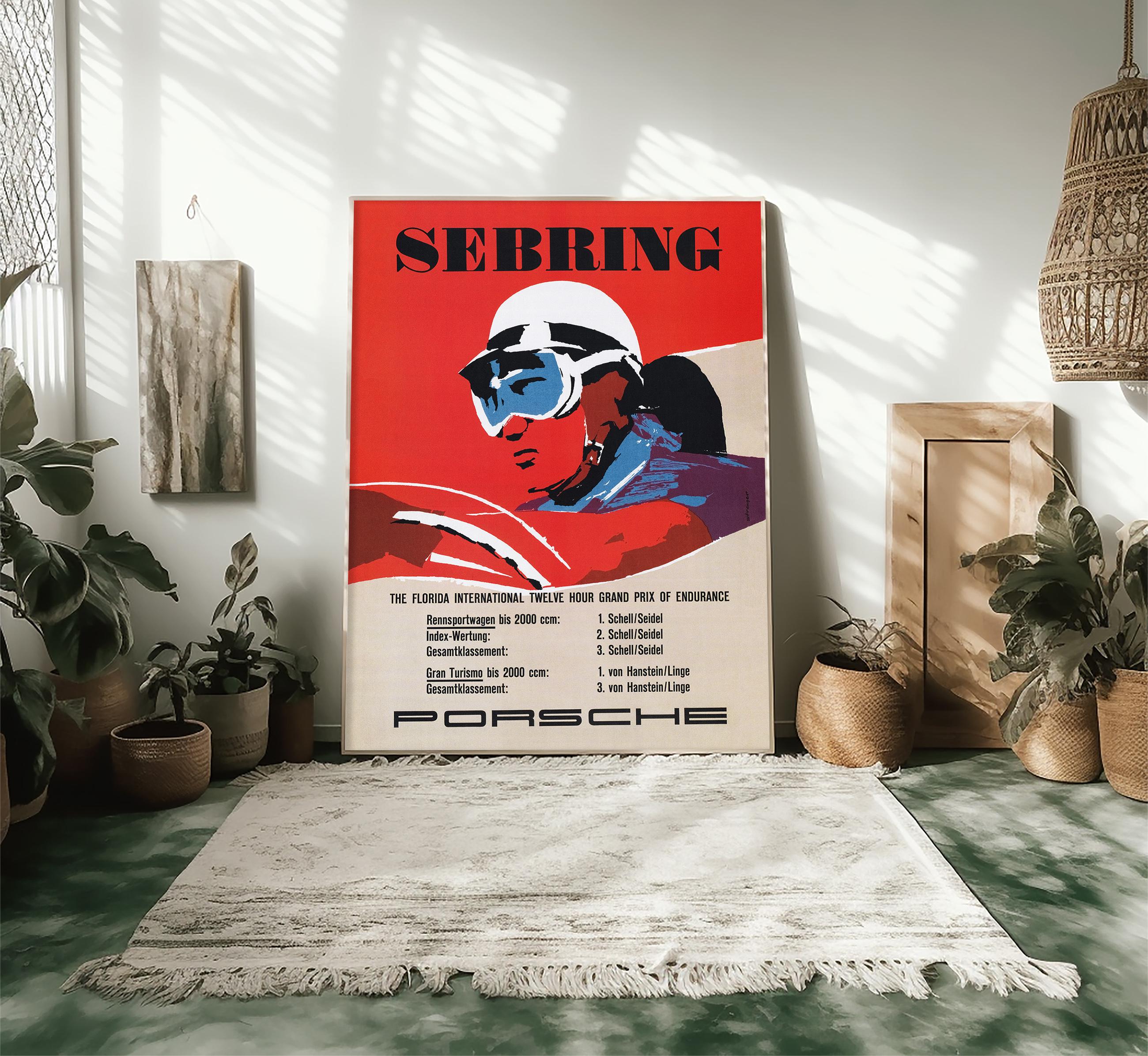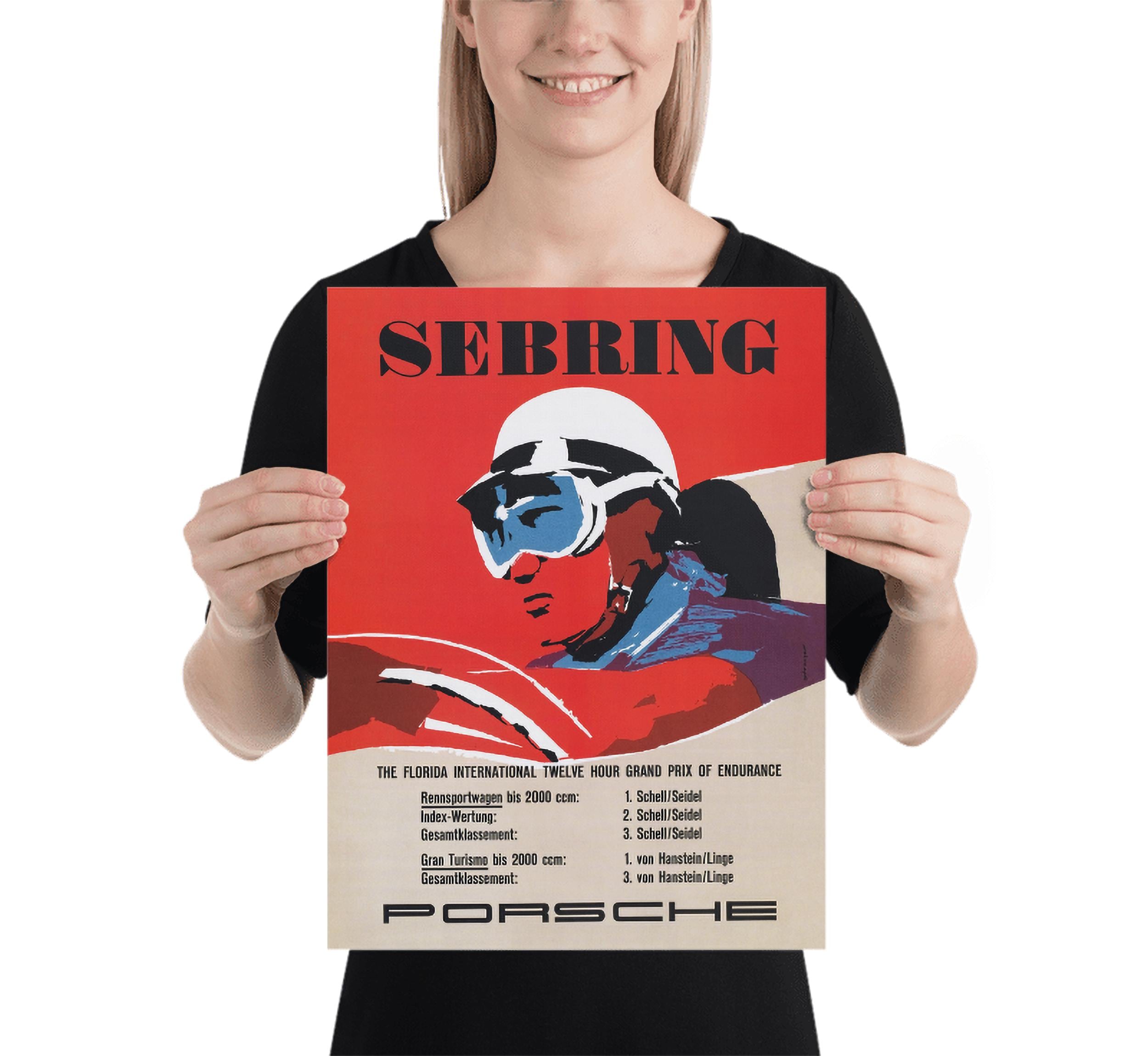 The original poster was created in 1957 to commemorate Porsche’s success at the Sebring race, where their lightweight engineering and unmatched performance helped cement their reputation in international motorsport. Today, it remains a sought-after collectible for car enthusiasts, racing fans, and vintage art collectors alike.