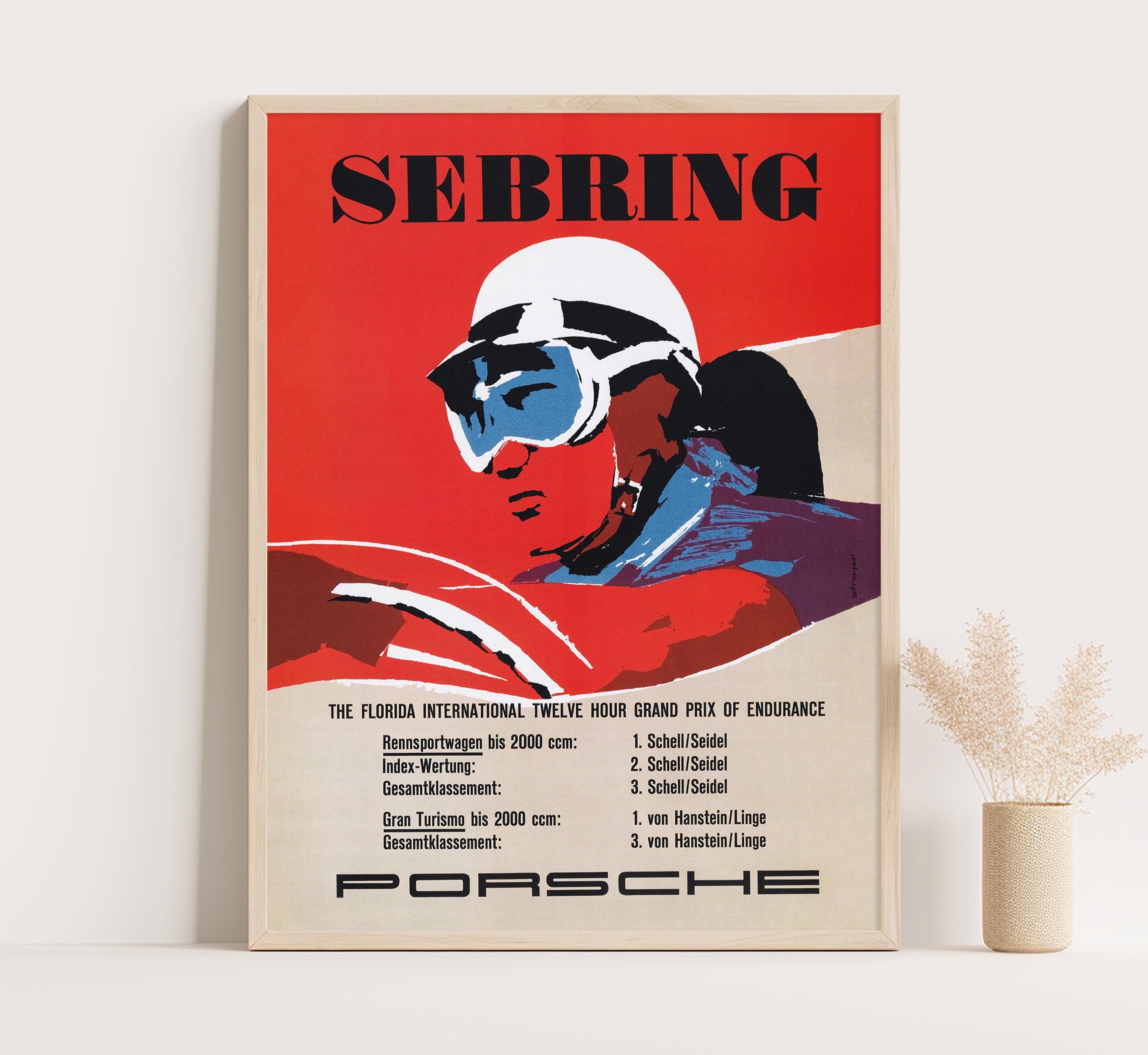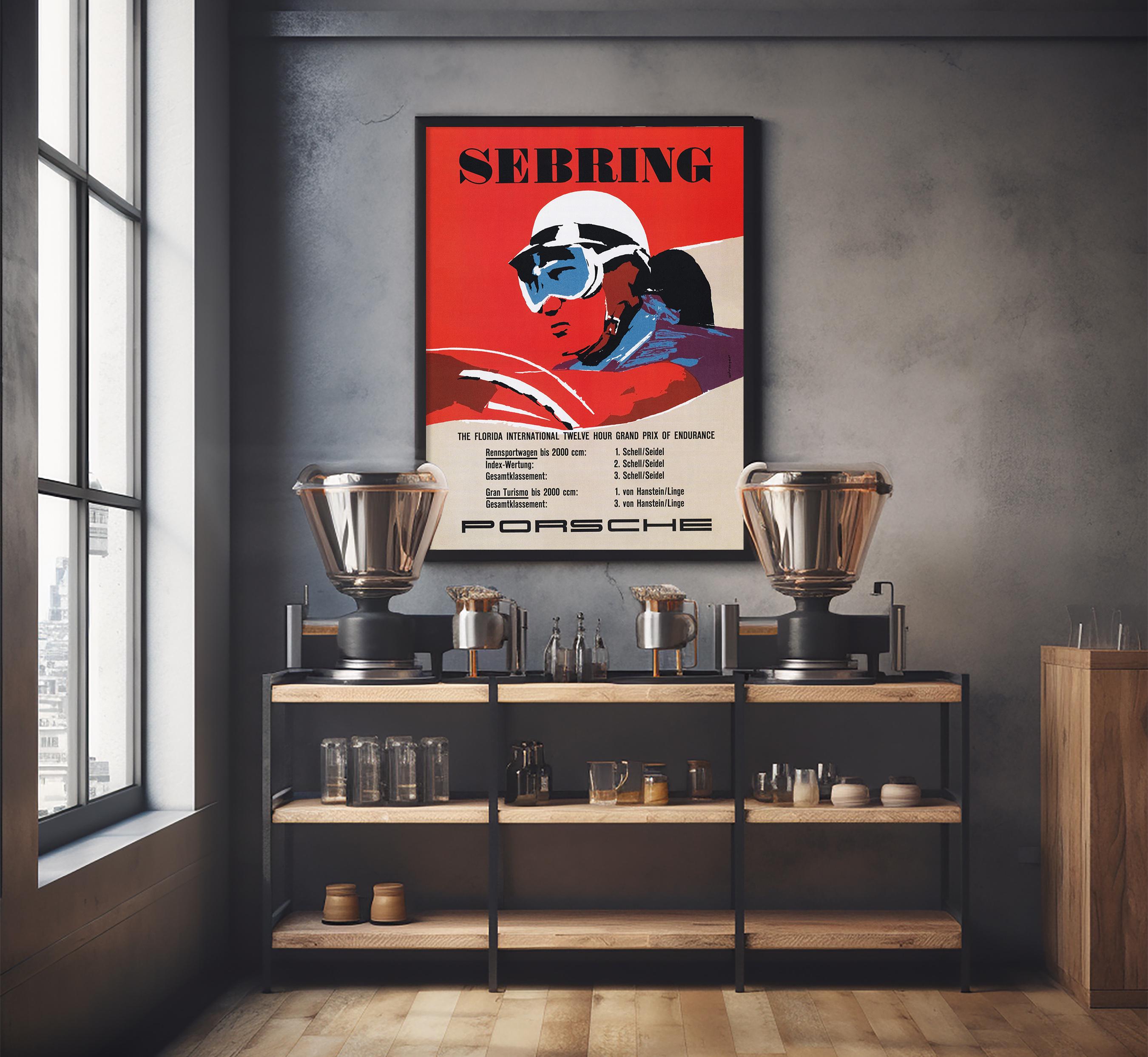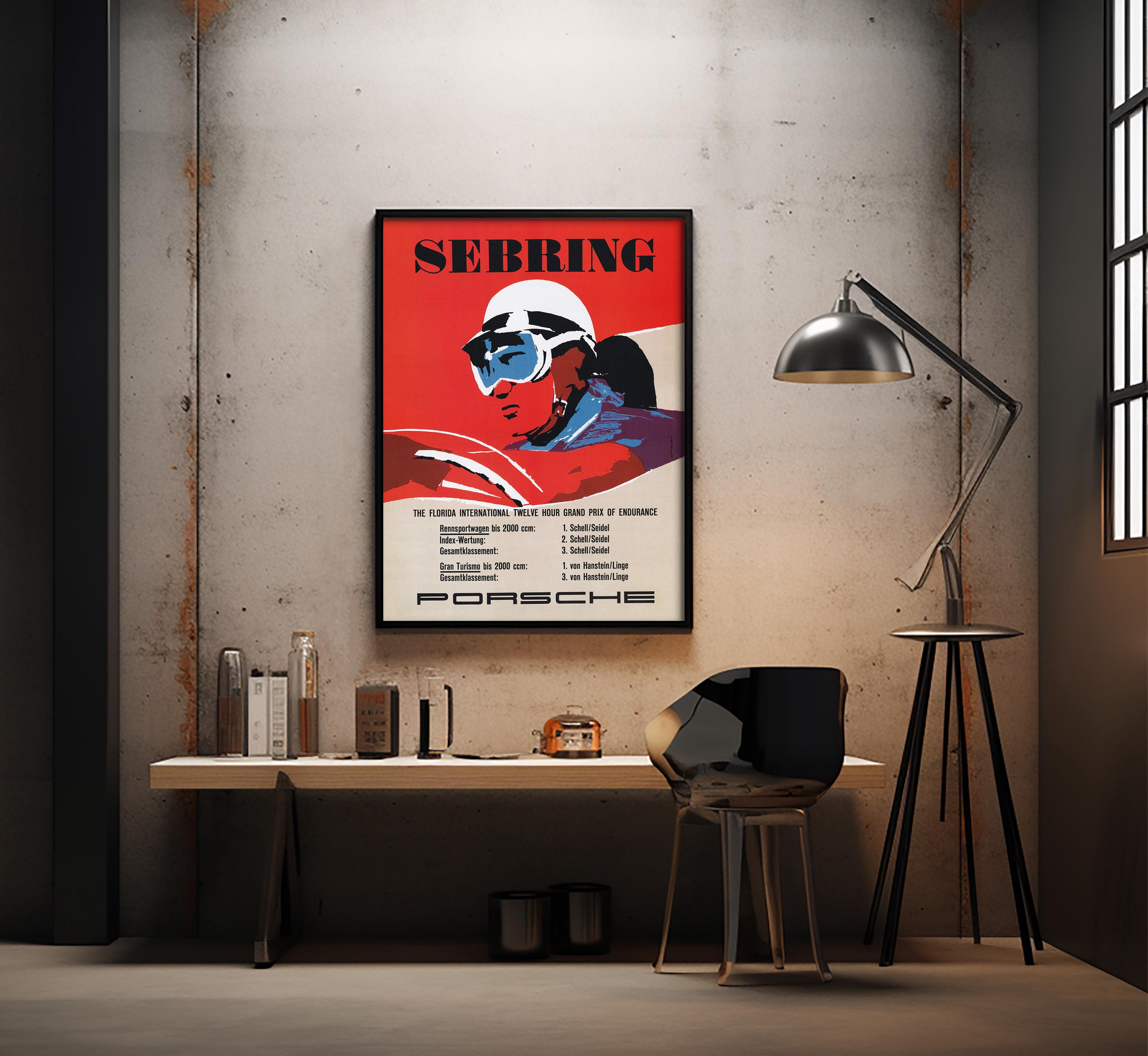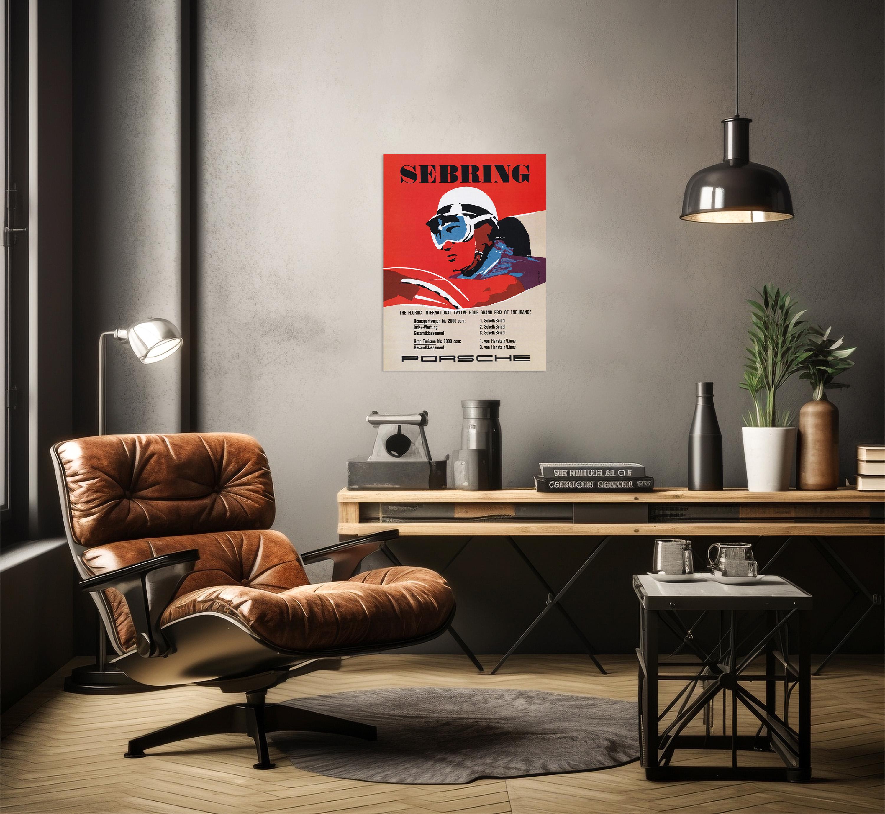 The original poster was created in 1957 to commemorate Porsche’s success at the Sebring race, where their lightweight engineering and unmatched performance helped cement their reputation in international motorsport. Today, it remains a sought-after collectible for car enthusiasts, racing fans, and vintage art collectors alike.