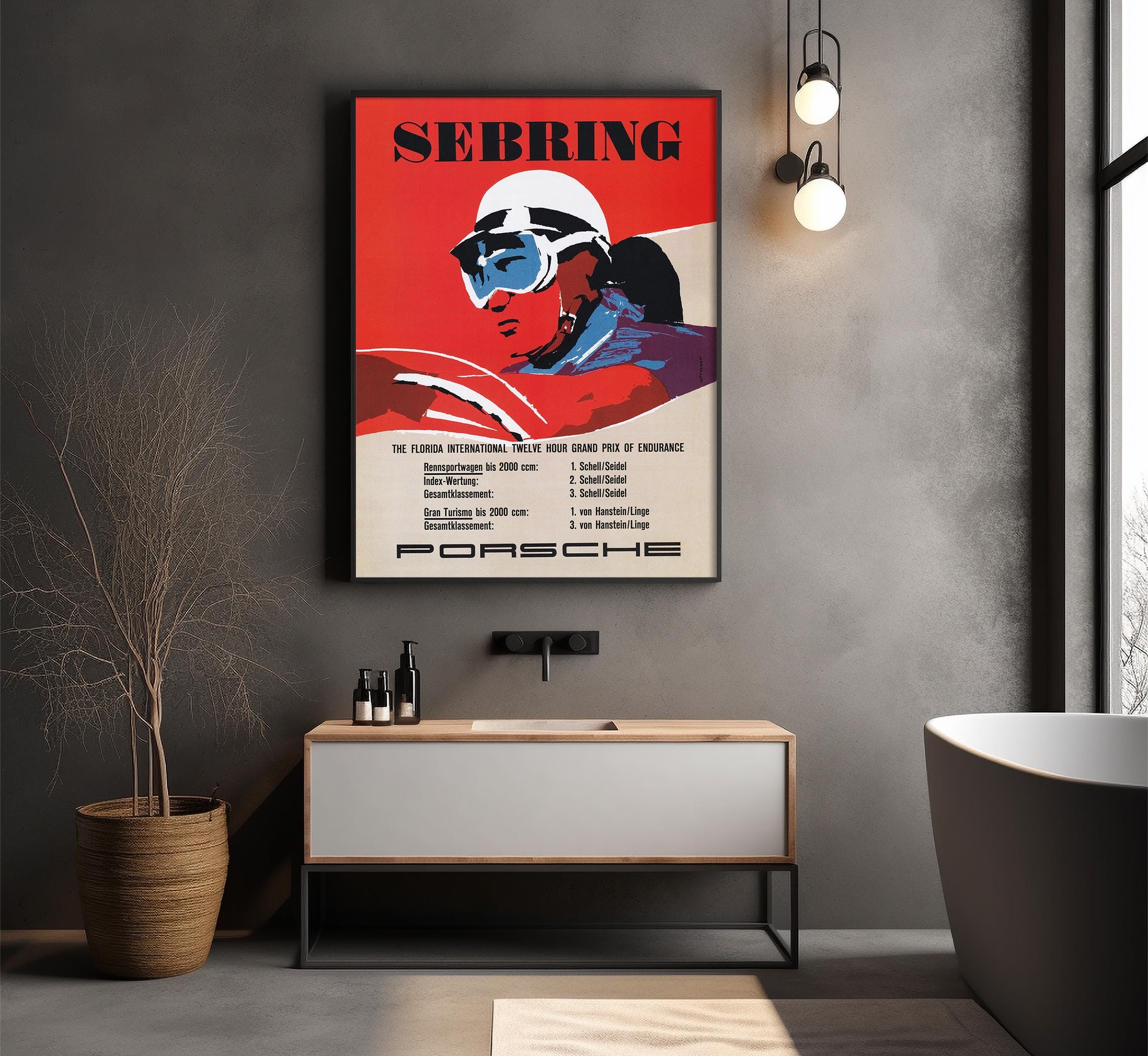 Perfect gift for Porsche fans and motorsport history lovers. This striking reproduction of the Sebring 1957 Porsche racing poster celebrates the legendary 12 Hours of Sebring Grand Prix of Endurance, one of the most iconic events in racing history. With bold red tones and a stylized driver in goggles and helmet, this design captures the raw spirit of Porsche’s endurance dominance in the late 1950s.